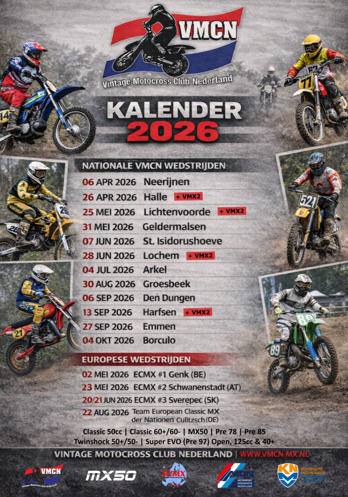 Ook in 2026 wacht ons weer een prachtig seizoen vol vintage motorcross én brommercross op karaktervolle circuits, verspreid door het hele land, met een mooie mix van vertrouwde locaties en geliefde klassiekers.